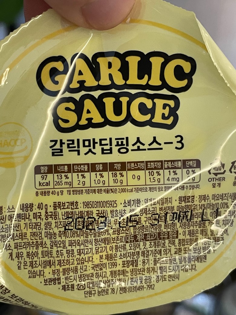 제가 받은 갈릭디핑소스는 가격 500원의 40g짜리 용기형 갈릭디핑소스였습니다.