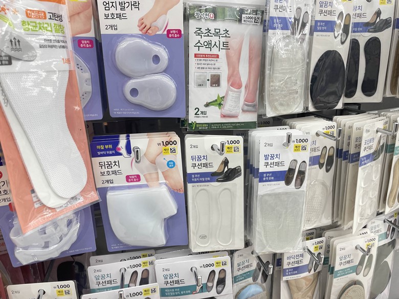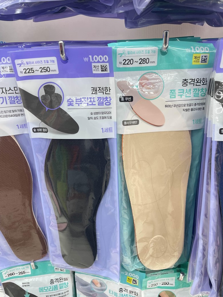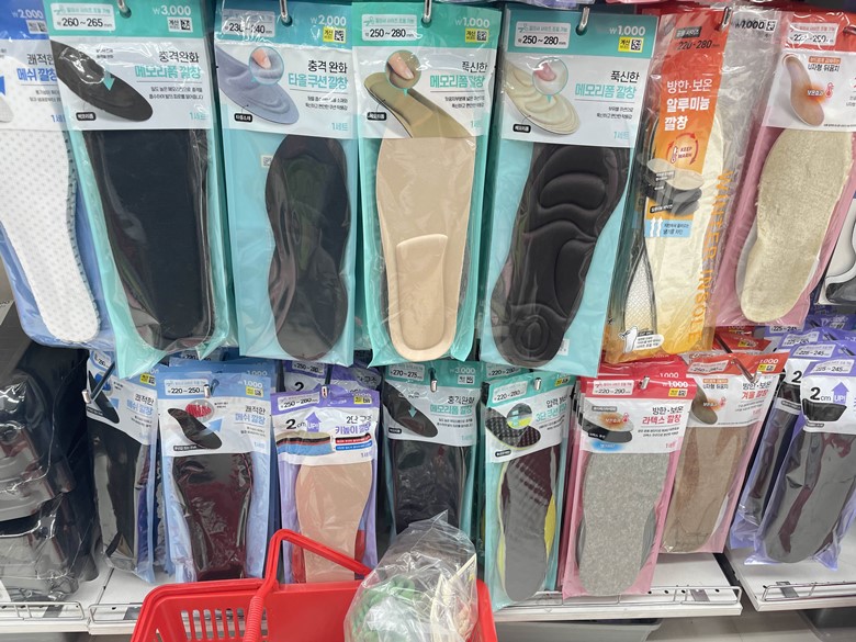 방문하는 기념으로 다이소에서 판매 중인 다양한 깔창들을 사진에 담아봤어요.