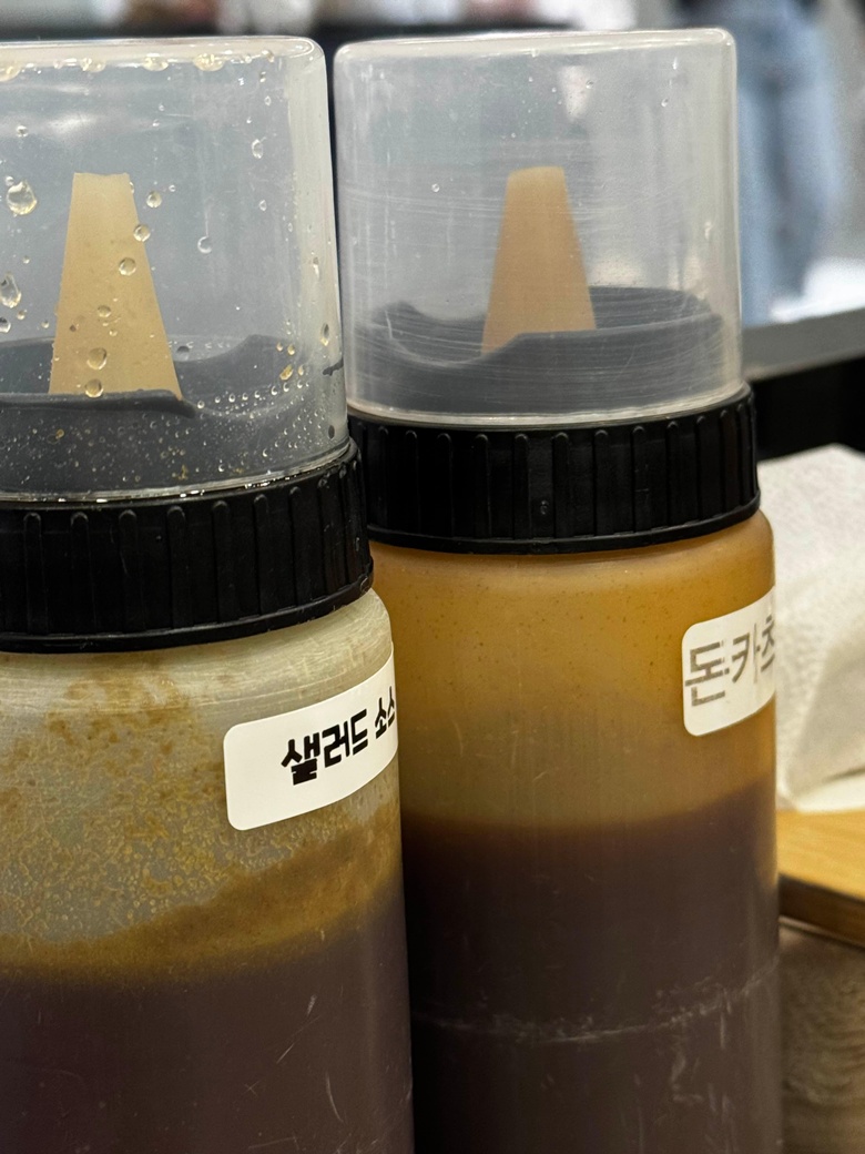 테이블 위에 있는 샐러드소스와 돈카츠 소스.